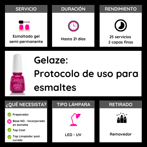 Contiene: 1 unidad de Gelaze Ruby Pumps 0,33 oz, 1 Gelaze Top Coat 0,33 oz, toallitas limpiadoras (26 unidades), manual de instrucciones, lima y palillo de naranjo.